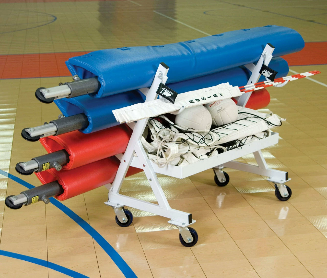 Bison’s heavy-duty design allows compact and easy storage and transport of up to two complete volleyball system. Compatible with any brand of 3″, 3-1/2″ or 4″ outside diameter posts. Non-marking, 4″ swivel casters. Bonus storage for net and padding.