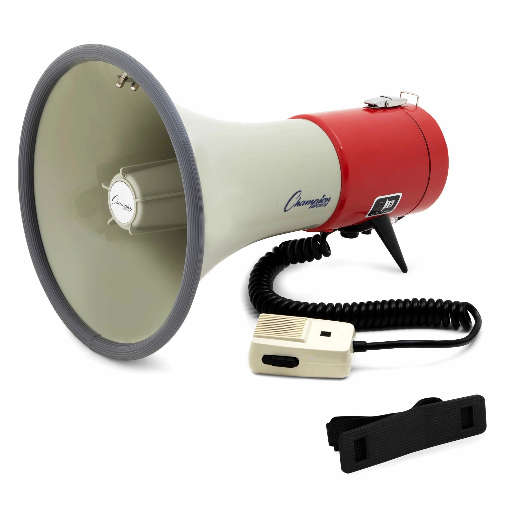 Powerful enough to be heard from 1200 yards away, the Champion Sports 16 Watt Megaphone provides clear and effective long-distance communication for stadiums, team practice, and large crowds. Equipped with a shoulder strap and handheld microphone, this megaphone can be comfortably operated with one or two people. The adjustable volume control allows you to adapt to different crowds and distances, while the powerful siren is useful for when you need to get their attention.
