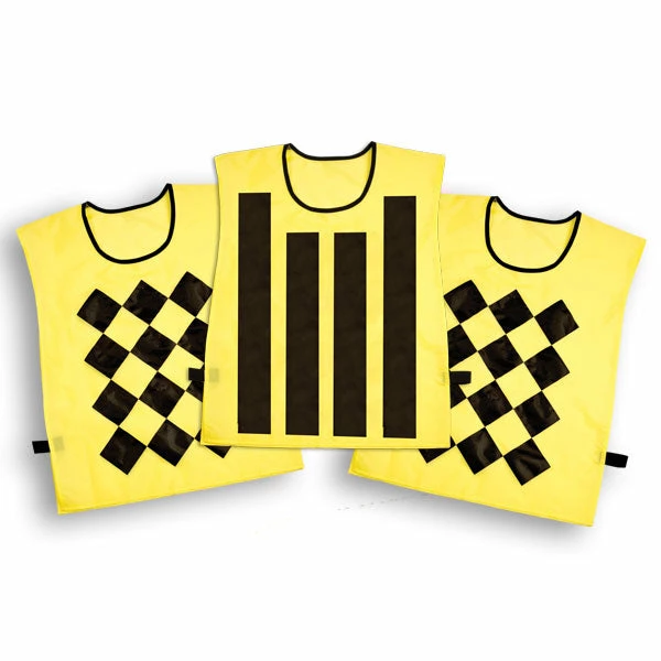 Keep game officials clearly visible out on the field with this set of Champion Sports Sideline Official Pinnies. The set features a pair of vests sporting a black diamond pattern to distinguish chain setters, while one featuring a striped pattern makes the down box holder stand out on the sidelines. The football official pinnies are made from durable nylon that can stand up to regular use, and they feature adjustable Velcro® closures to provide a secure, comfortable fit for officials of all sizes.