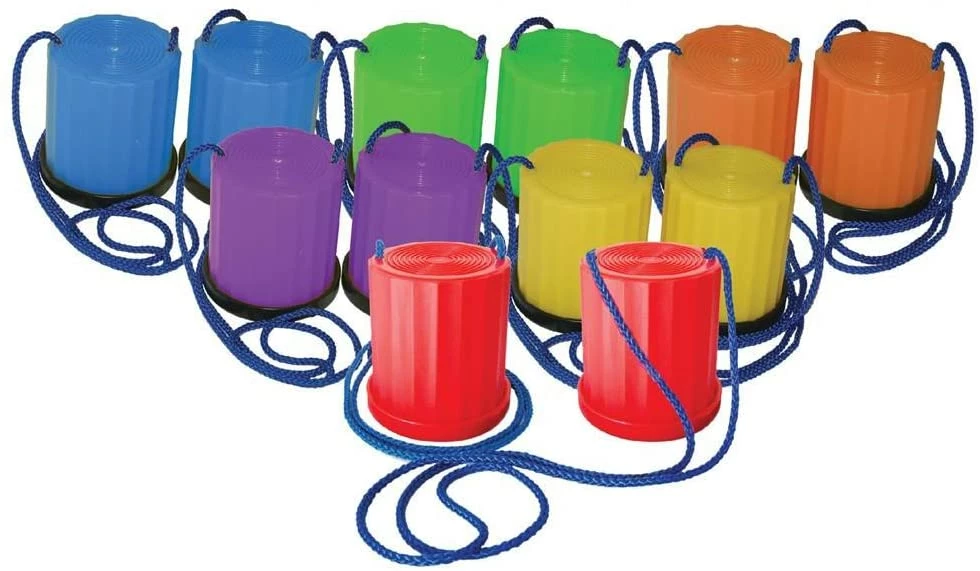 An entertaining addition to any school gym or party room, the Champion Sports Plastic Platform Stilts Set allows users up to 175 lbs to practice their balance and reach exciting new heights. Adjustable hand cords provide extra stability and control, while the non-marring rubber base allows these platform stilts to be used on any indoor floor. Available in a colorful set of six, this stilts set can fit all feet sizes so everyone can join in on the fun.