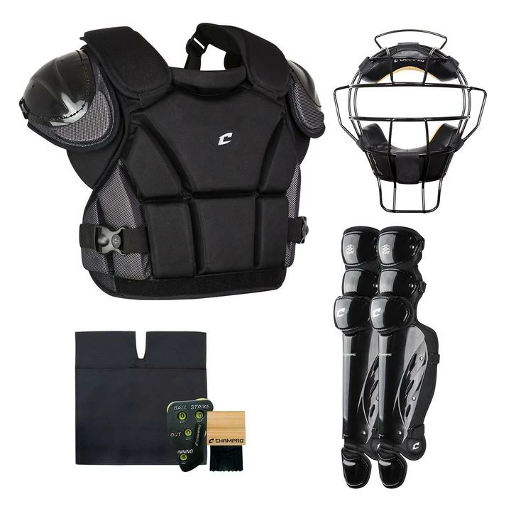 Don’t piece together gear for behind-the-plate protection–The CHAMPRO Varsity Umpire Kit includes everything needed to get the job done more safely. CHAMPRO Varsity Umpire Kits contain an adult mask, chest protector, leg guards, ball bag, brush, and 4-dial indicator.