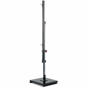 All steel construction with black powder coat finish. 18” square base includes wheels for easy mobility. Height scales read both English and Metric from 2′ to 8′. Meets High School and NCAA specifications.