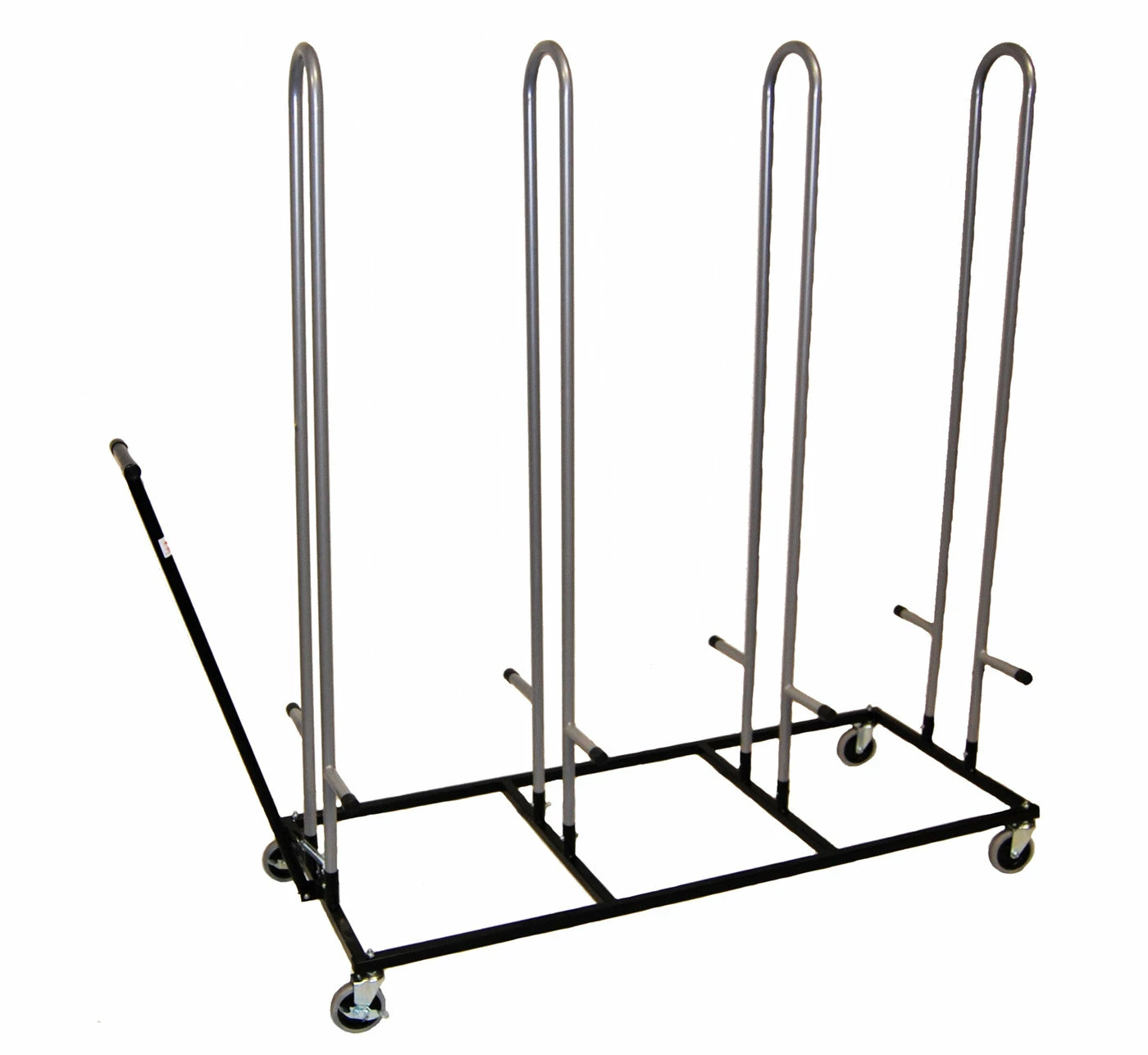 Heavy duty steel bottom frame Retractable pull handle Large locking wheels allows for transport on and off the field as well as in the locker room. Steel uprights Bottom position bar allows for neat and orderly stacking.